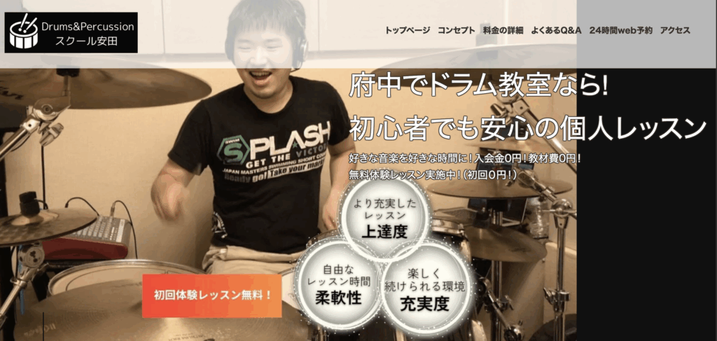 もう一つ、府中市でドラム教室として確実に確認できるのが Drums & Percussionスクール安田 です。公式サイトには「府中でドラム教室ならスクール安田」を掲げ、無料体験レッスンやフレキシブルな予約システムを案内しています。