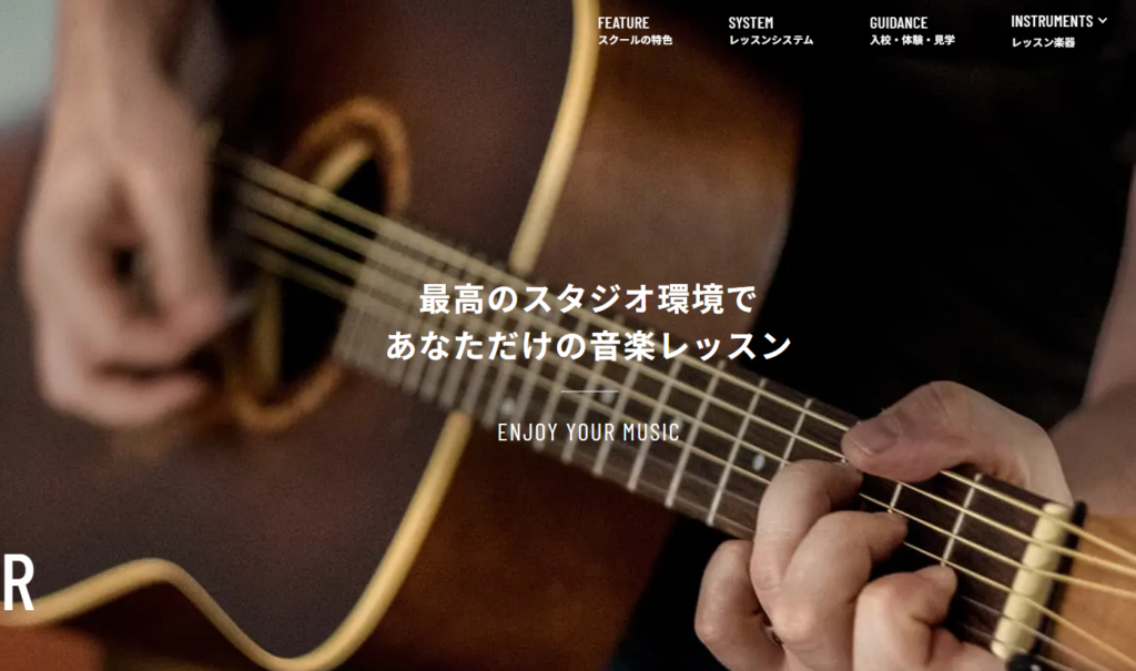 ギターだけでなく、ベース・ドラム・ピアノなど複数の楽器コースが用意されていて、「どの楽器も定額で通い放題」というスタイルをとっています。